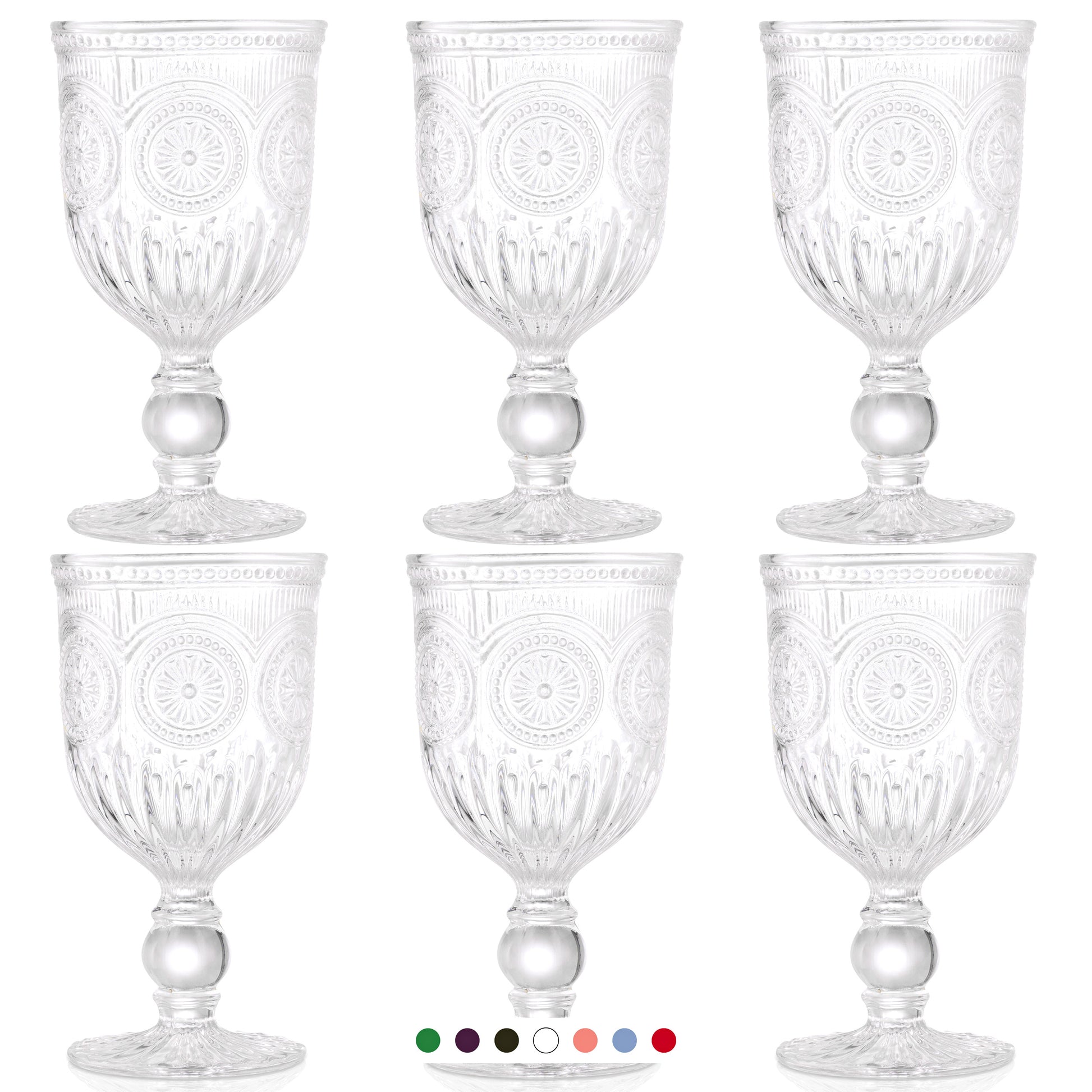 - The embossed water goblets with Sunflower inspired pattern are classic. Pair with our matching Christmas glasses drinkware for a glamorous and pretty table scape filled with love and enjoy as you come together with friends and family, who will appreciate these vintage wine glasses are as individual as you. Wine tumblers embossed glass drinking goblets are sure to turn heads. Say no to boring and yes to colored wine glasses. Glass tumblers are fancy, classy and super cute and ever so romantic!