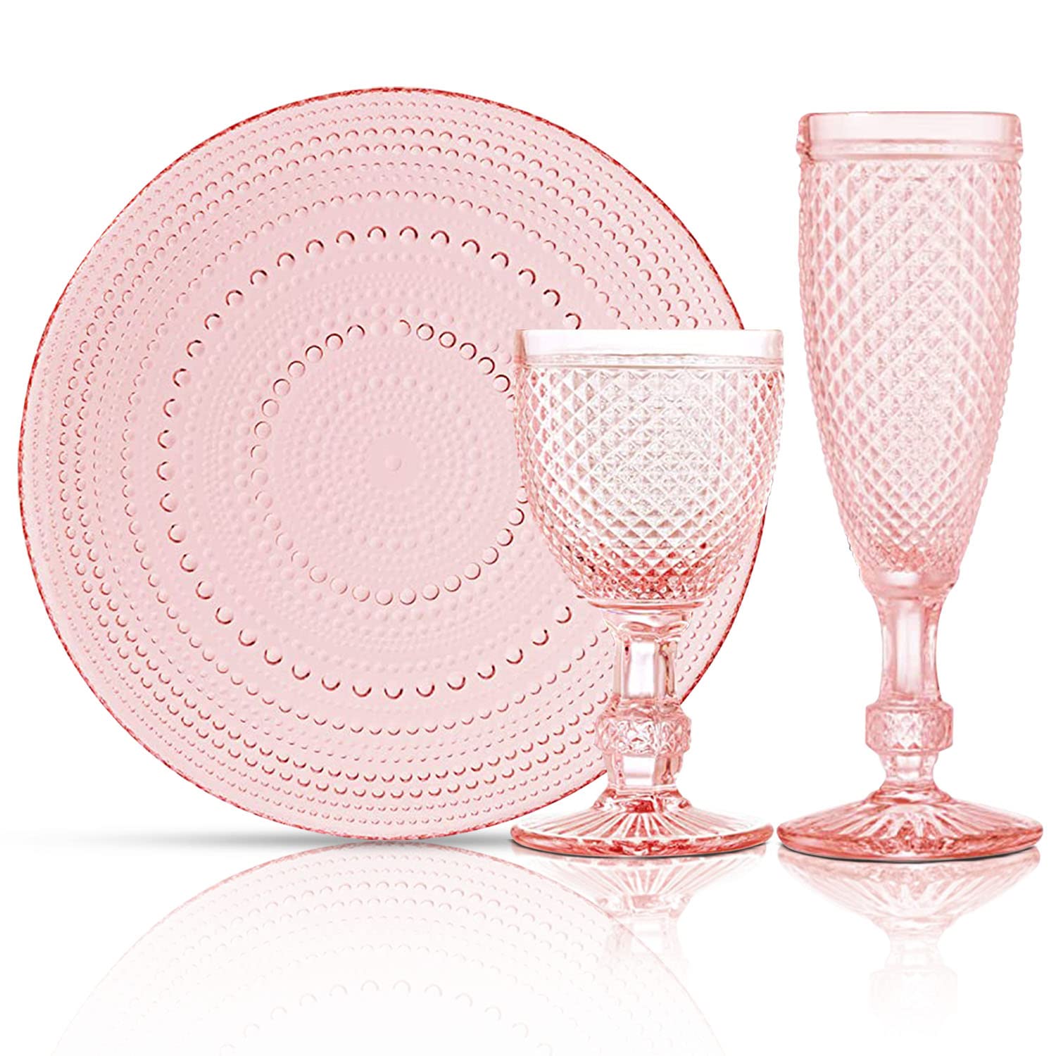 - At Yungala, we stand behind the quality of our products and offer a 100% satisfaction guarantee. With our no-risk purchase policy, you can enjoy your new fancy wine glasses and plates worry-free. So why wait? Order your Pink Glass Plates and Pink Wine Glasses bundle today and start entertaining in style!