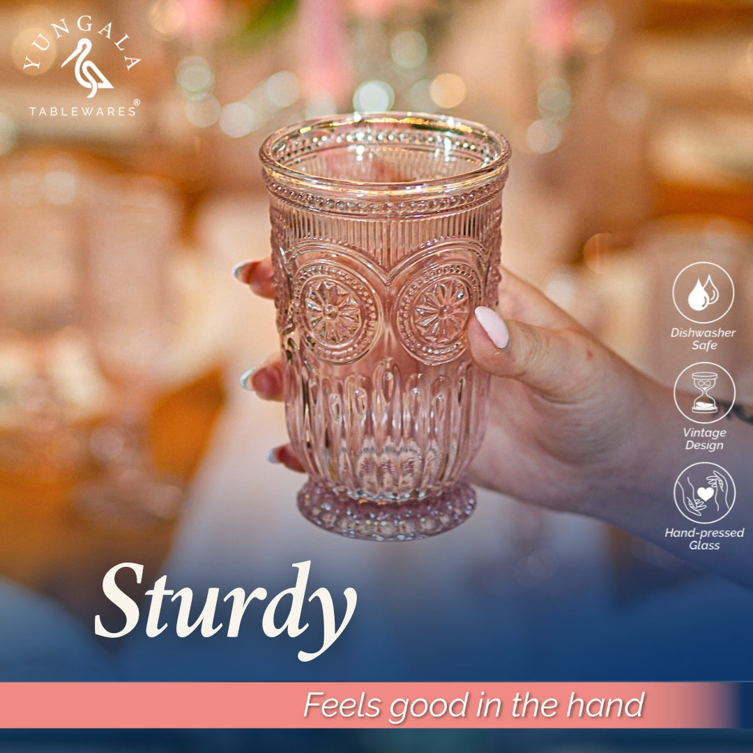 Featuring a vintage-inspired embossed pattern and a distinctive footed base, these pink tumblers add charm and personality to any table. Pair with matching pink wine glasses, champagne glasses, small tumblers, or plates for a cohesive pink tablescape.