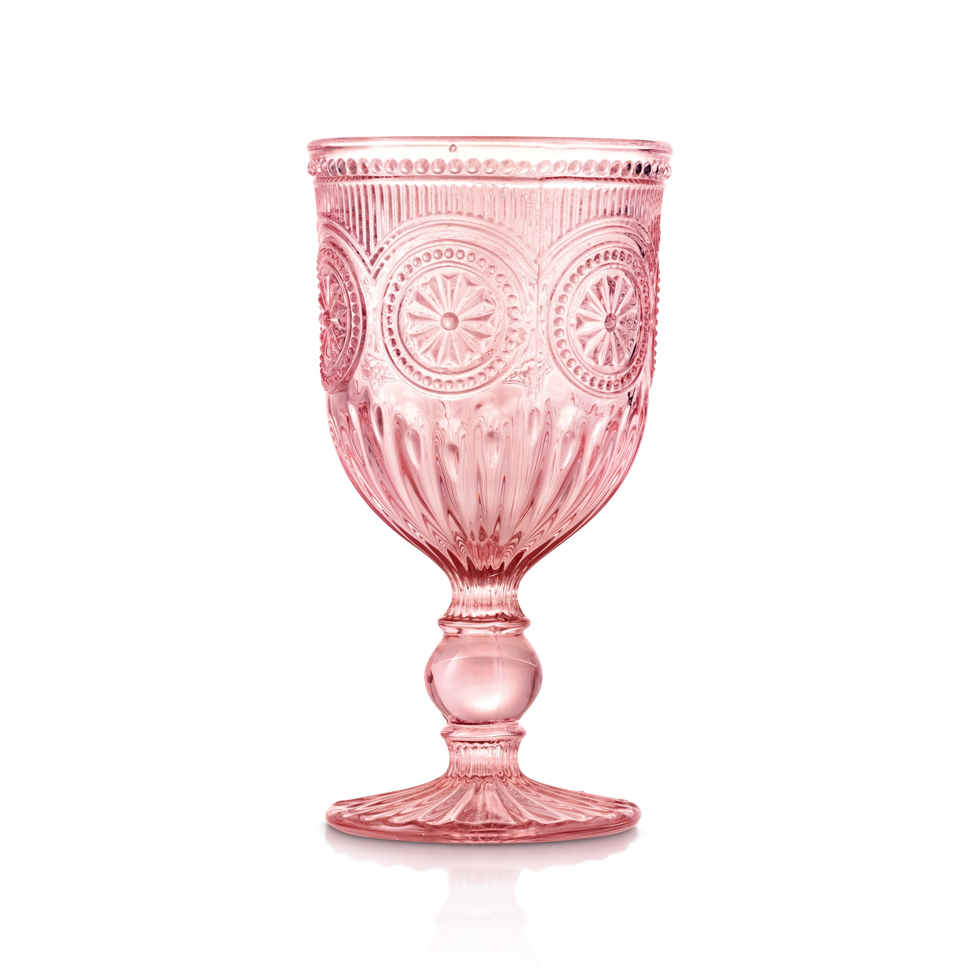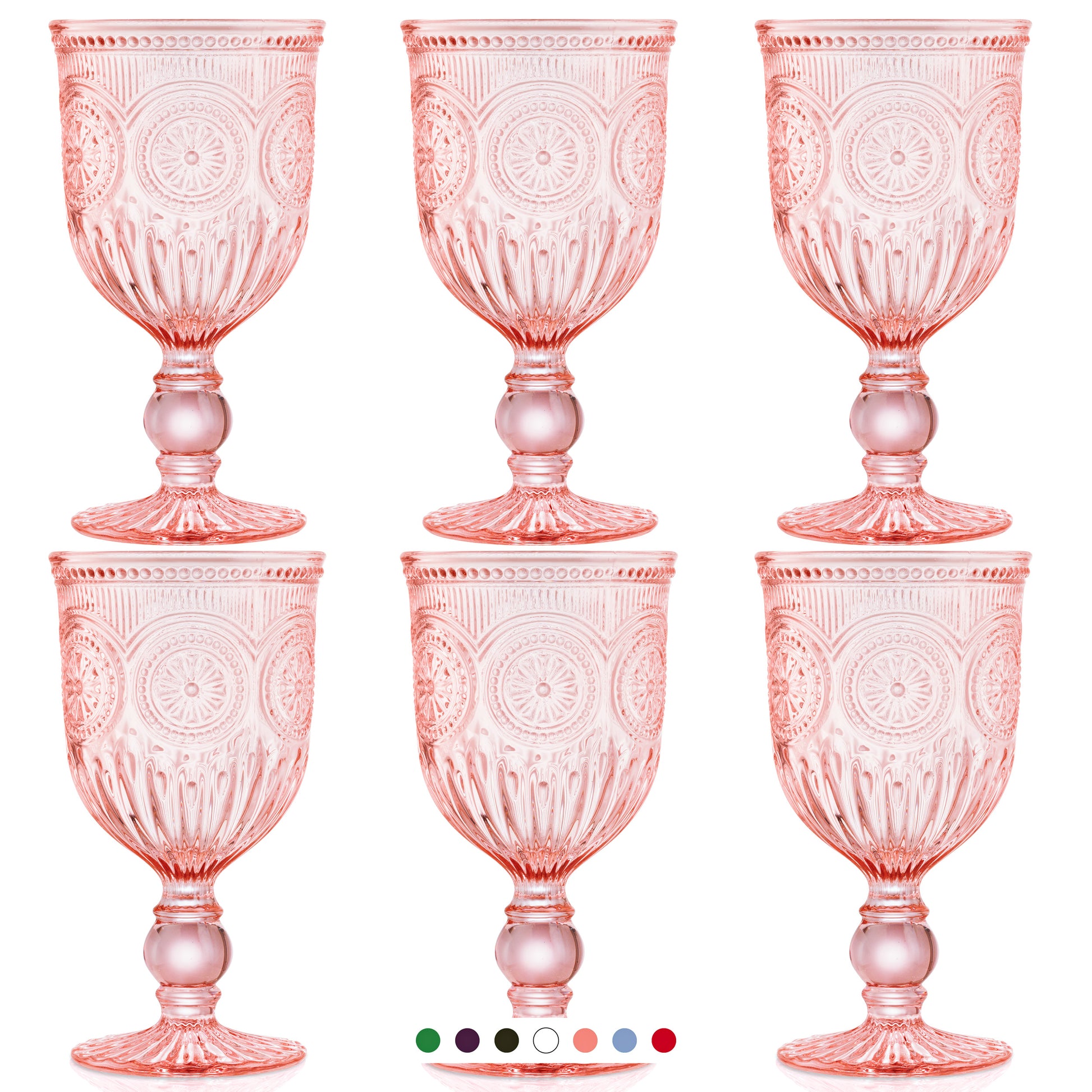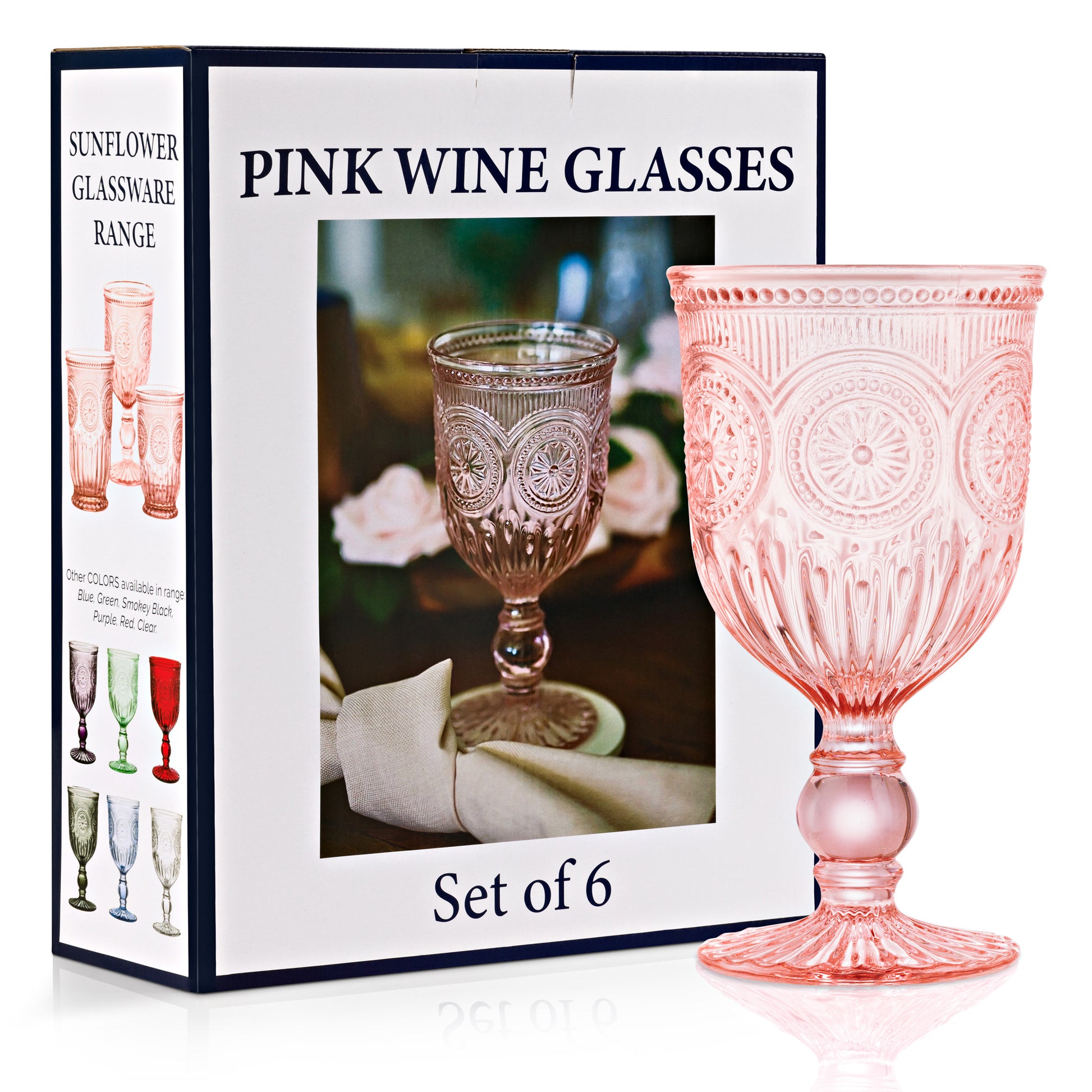 - The embossed pink glassware with Sunflower inspired pattern is classic vintage glassware. Pair with our matching pink water tumblers for a glamorous and pretty table scape filled with love and enjoy as you come together with friends and family, who will appreciate these goblet party glasses are as individual as you. Vintage glassware embossed glass drinking goblets are sure to turn heads. They are fancy, classy and super cute and ever so romantic!