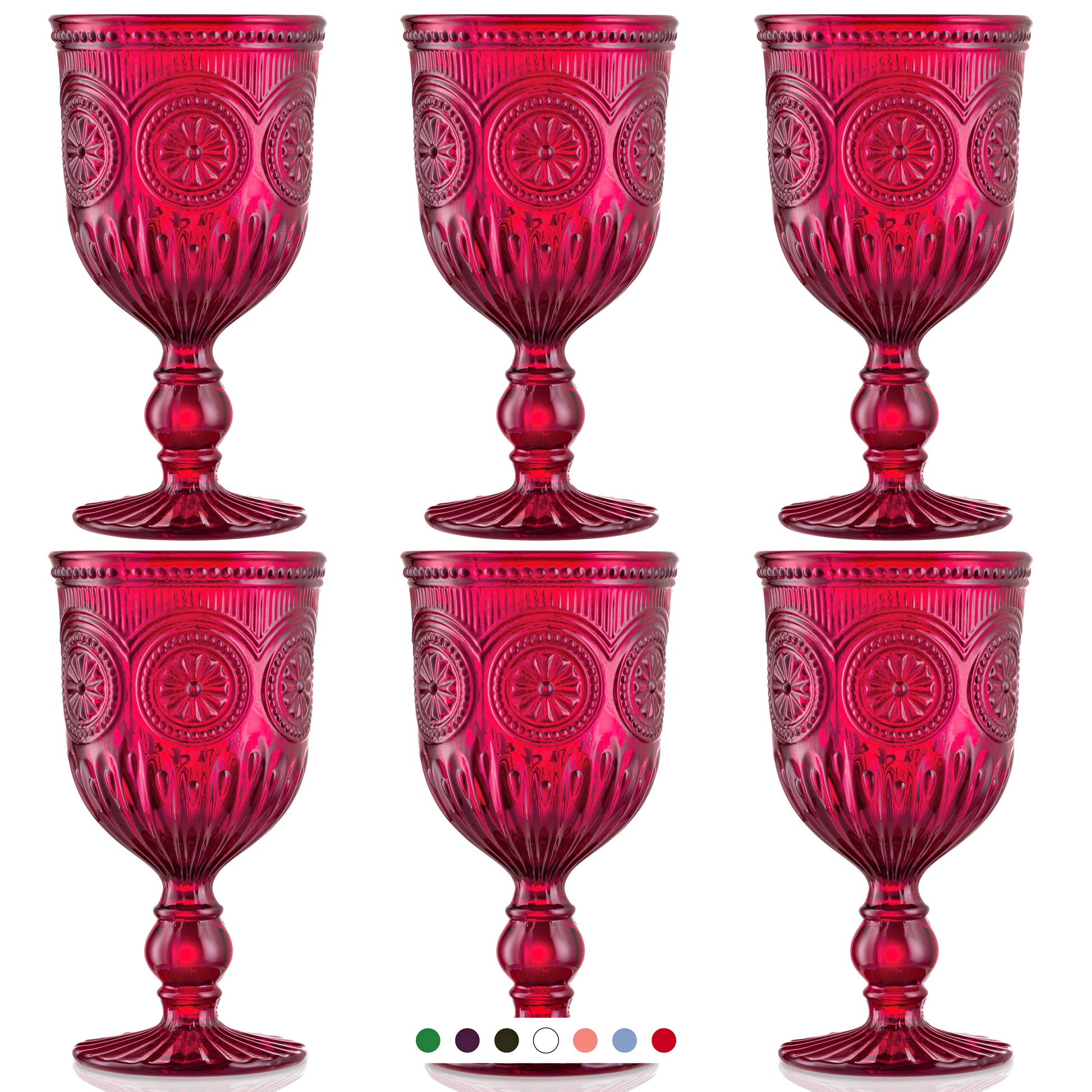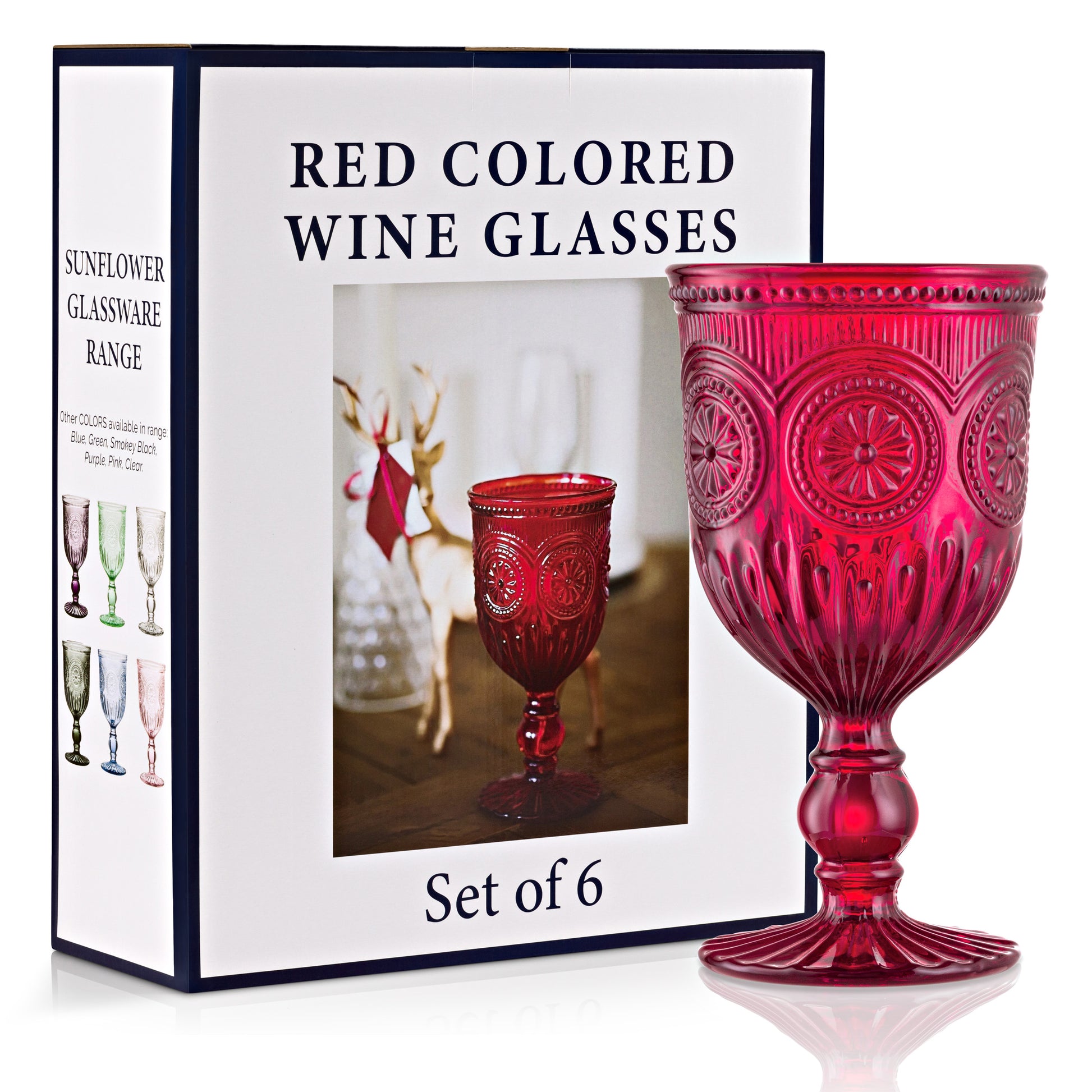- embossed red glassware with sunflower inspired pattern is classic vintage glassware Pair with our matching red goblets or tumblers for a glamorous and pretty tablescape filled with love The and joy as you come together with friends and family, who will appreciate these goblet party glasses are as individual as you. Vintage glassware embossed glass drinking goblets are sure to turn heads. Say no to boring and yes to colored wine glasses.