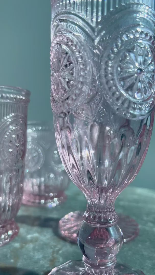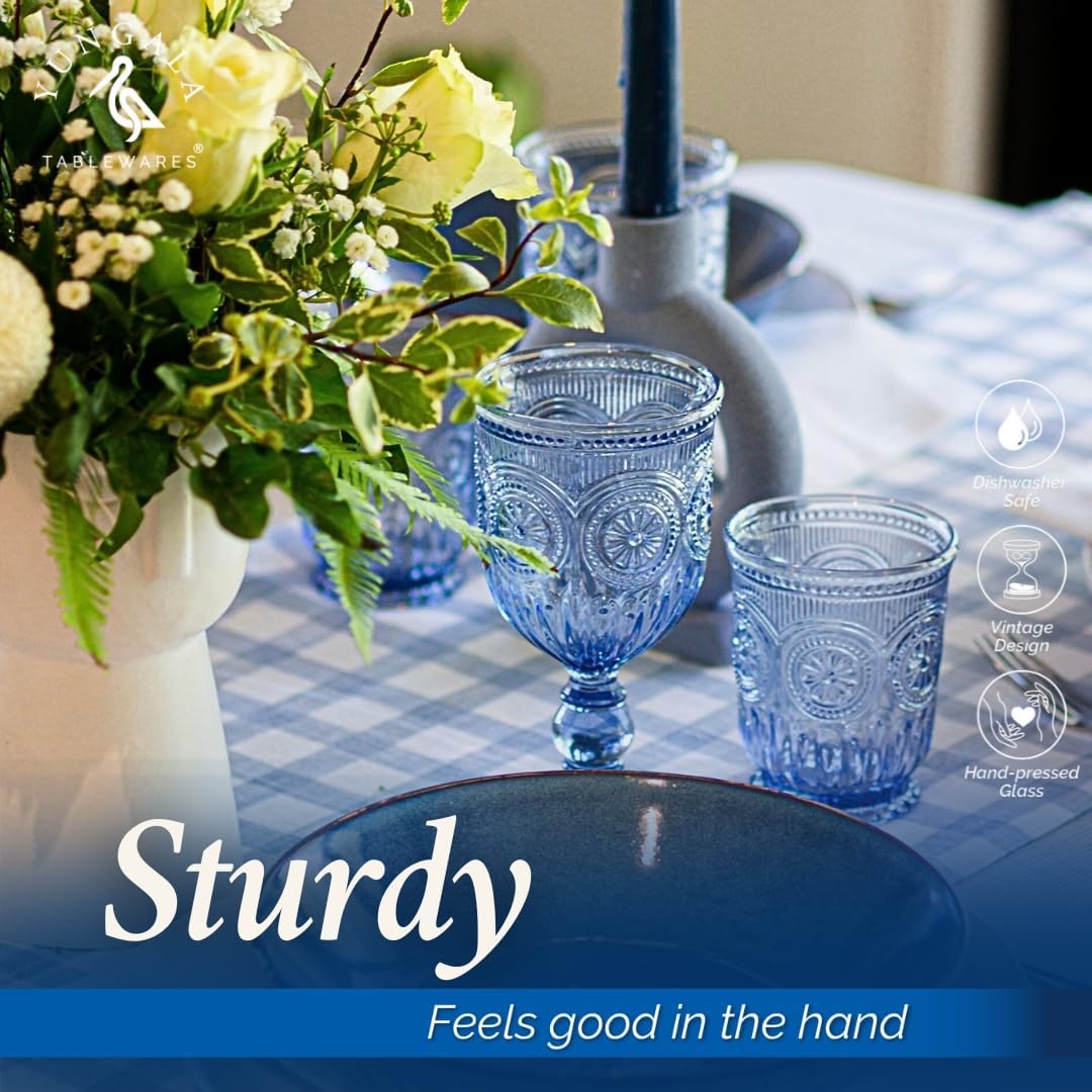 - The beautiful vintage design n our small water glasses also matches the tall blue tumbler and blue wine glasses.