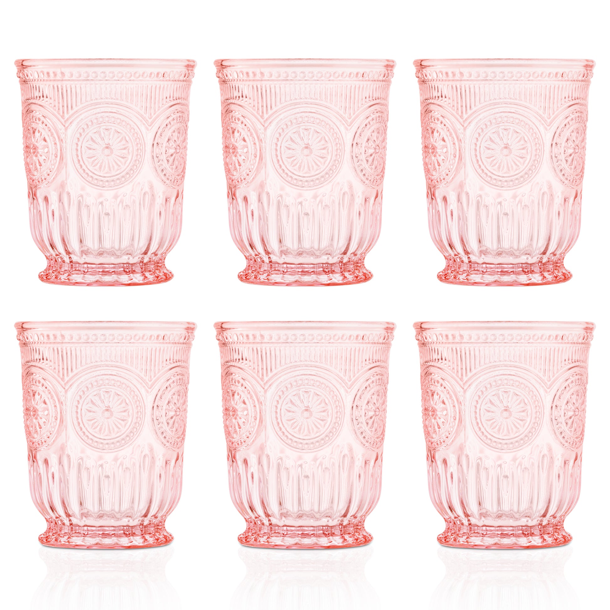 - You will admire our large pink glasses as they have a pretty vintage glassware appeal with a sunflower emboss pattern and the unique footed glass bringing a little bit of fancy to the everyday. Your friends will be sure to notice your pink drinking glasses in a light cotton candy color.