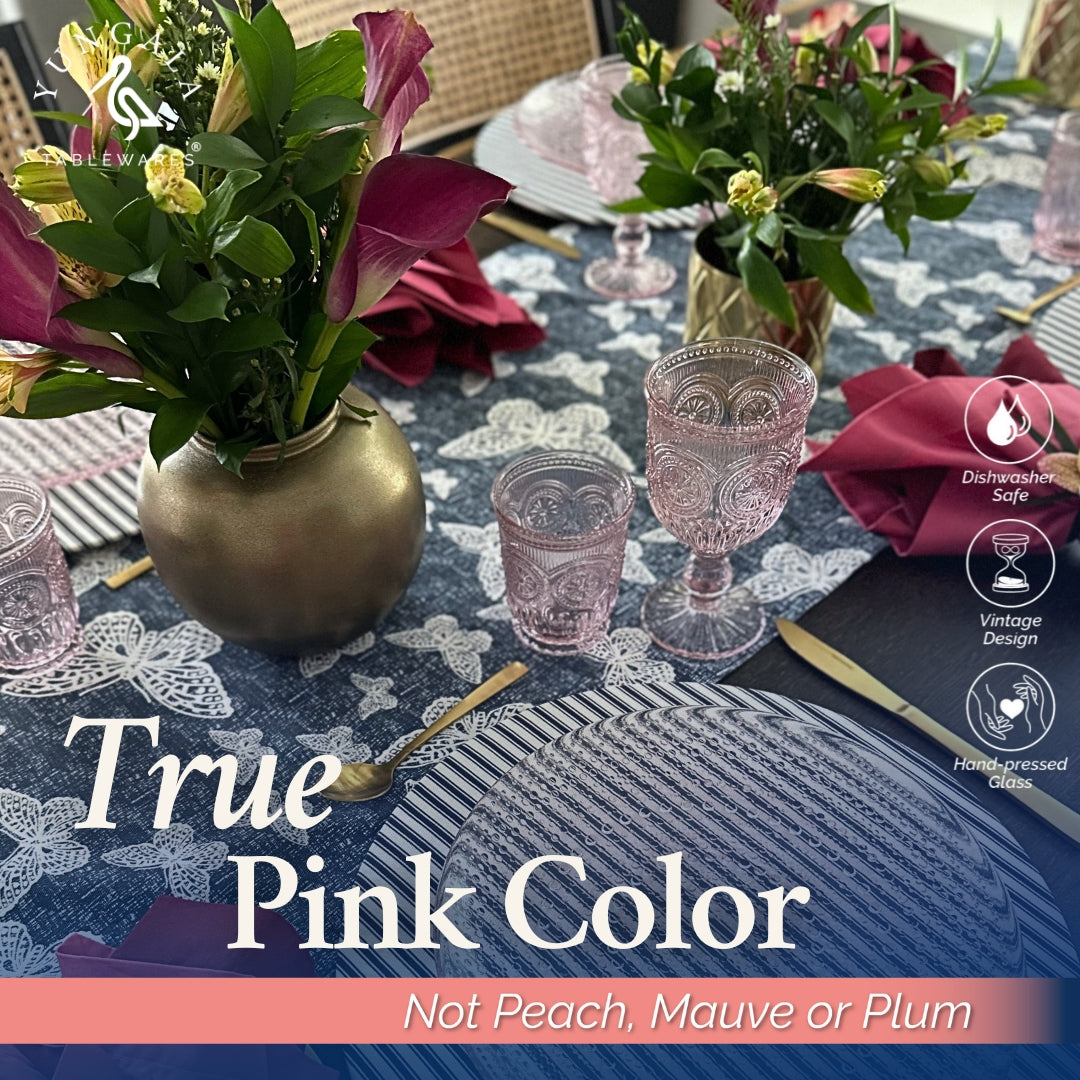 Featuring a classic embossed sunflower-inspired pattern and a subtle footed base, these pink tumblers add vintage charm and a touch of elegance to any table. Pair with matching pink wine glasses for a coordinated look.