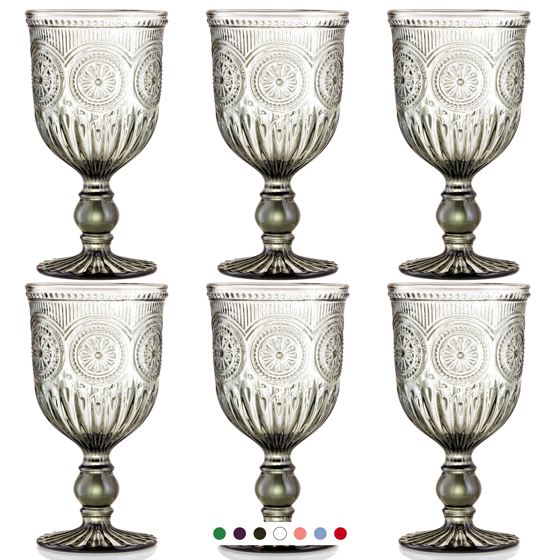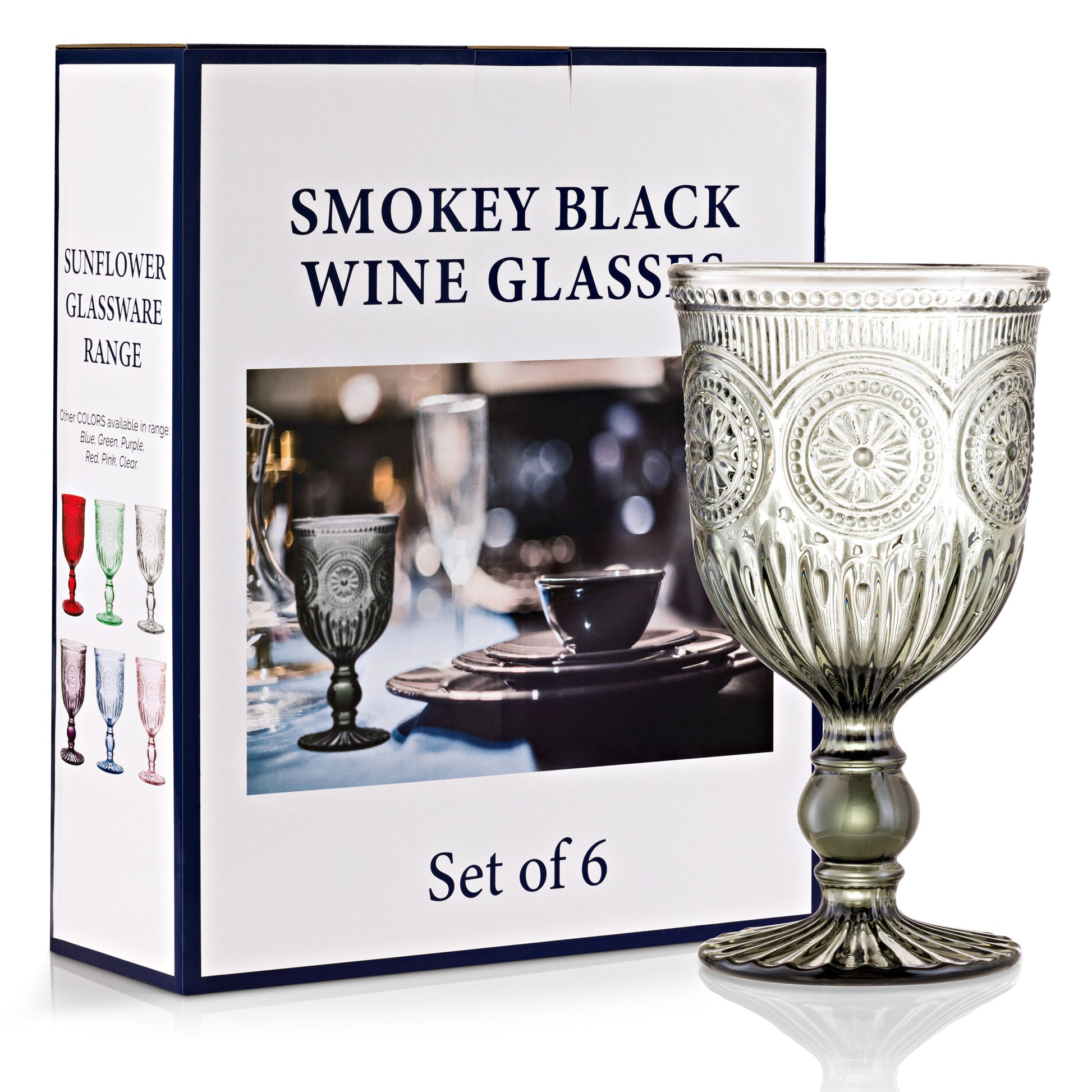 - The embossed Smoke glassware with Sunflower inspired pattern is classic vintage glassware. Pair with our matching SMOKE water tumblers for a glamorous and pretty table scape filled with love and enjoy as you come together with friends and family, who will appreciate these goblet party glasses are as individual as you. Vintage glassware embossed glass drinking goblets are sure to turn heads. They are fancy, classy and super cute and ever so romantic!