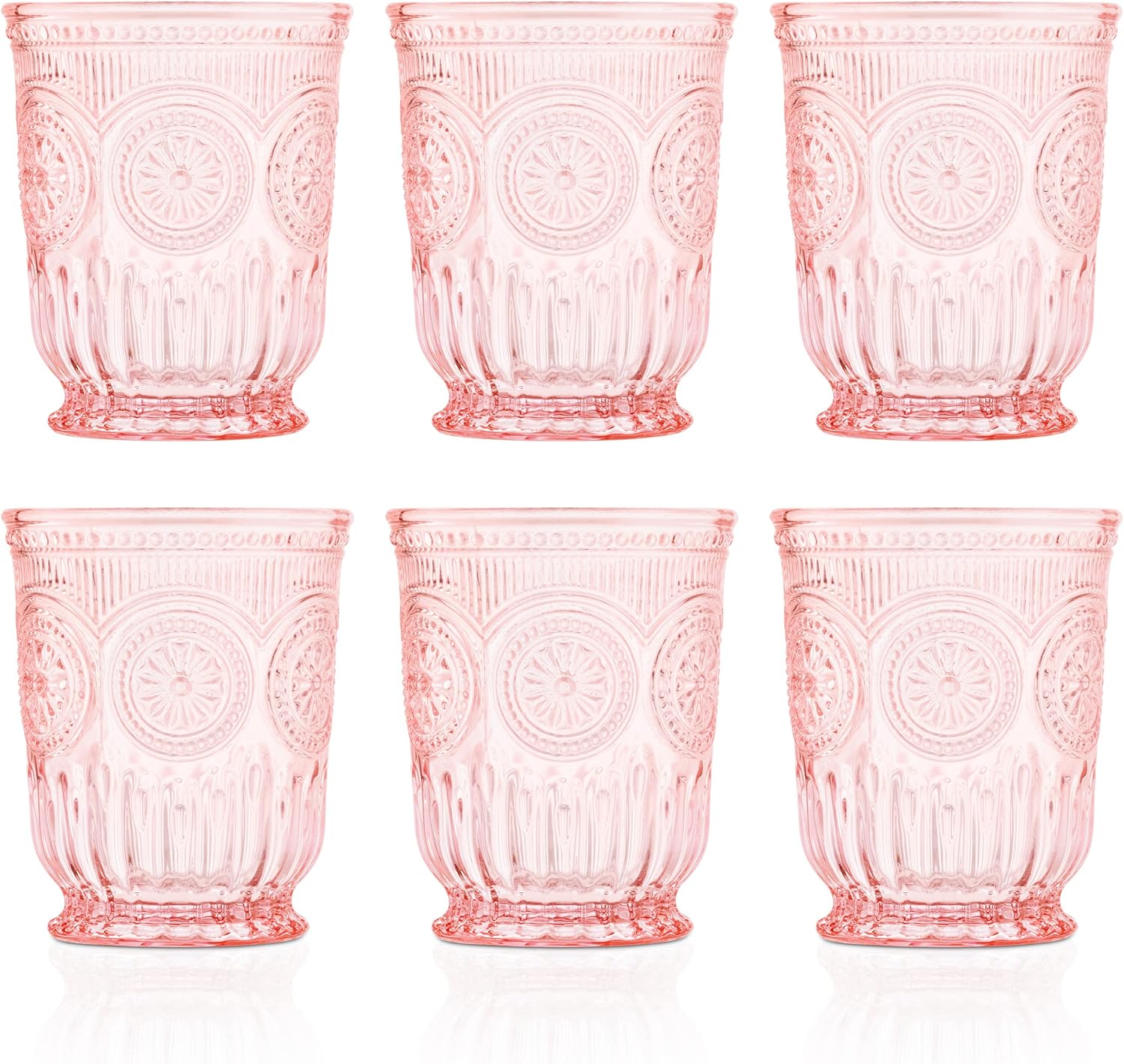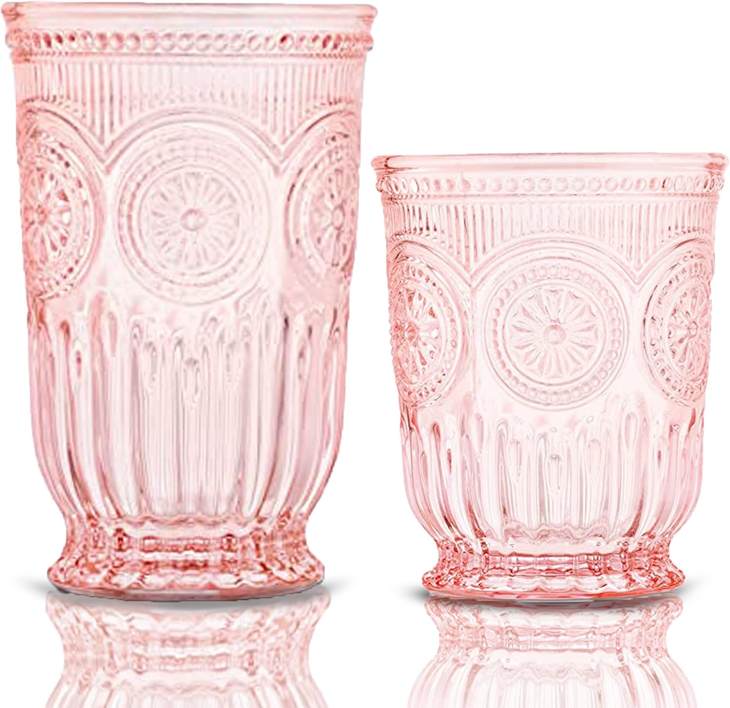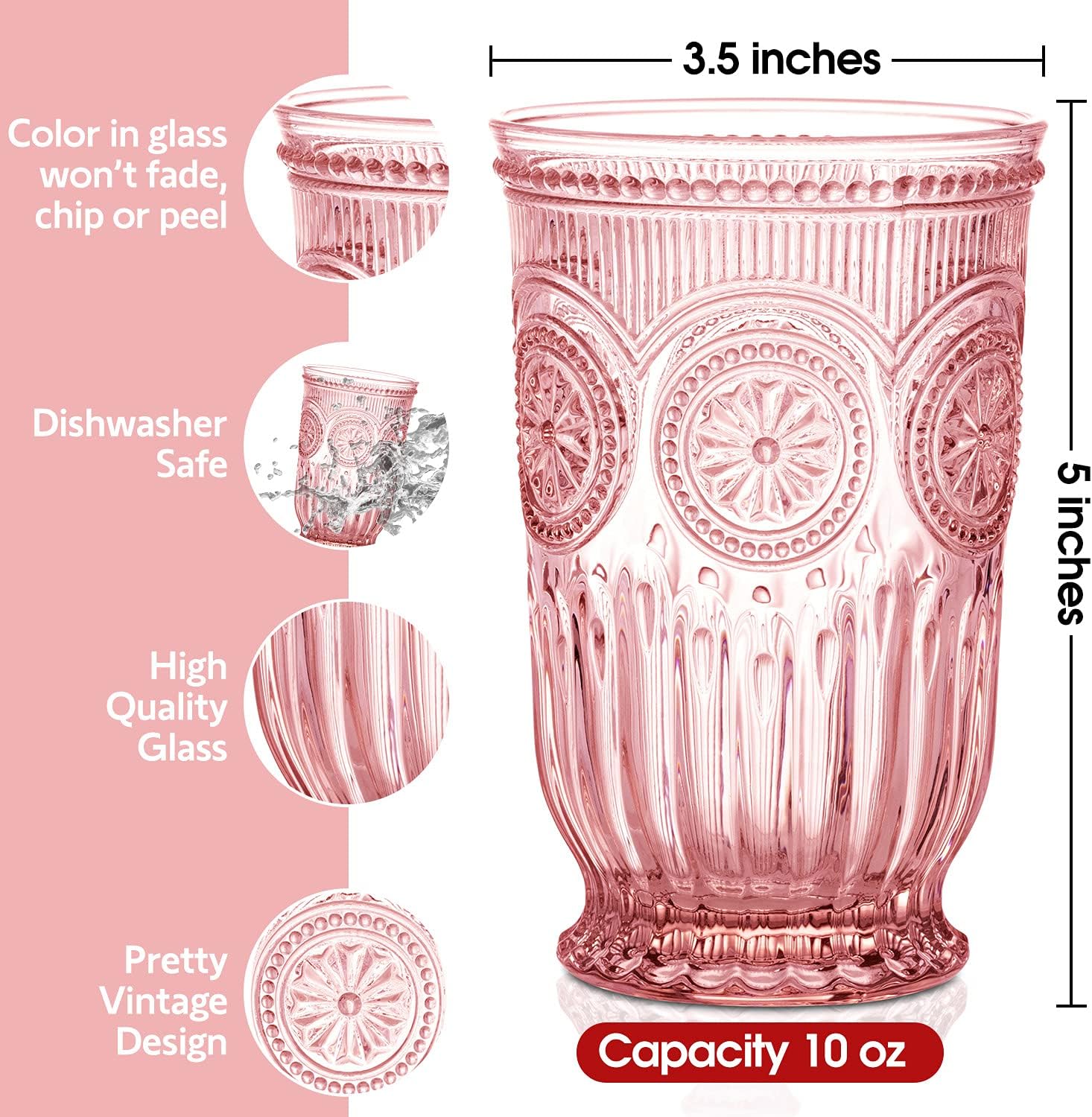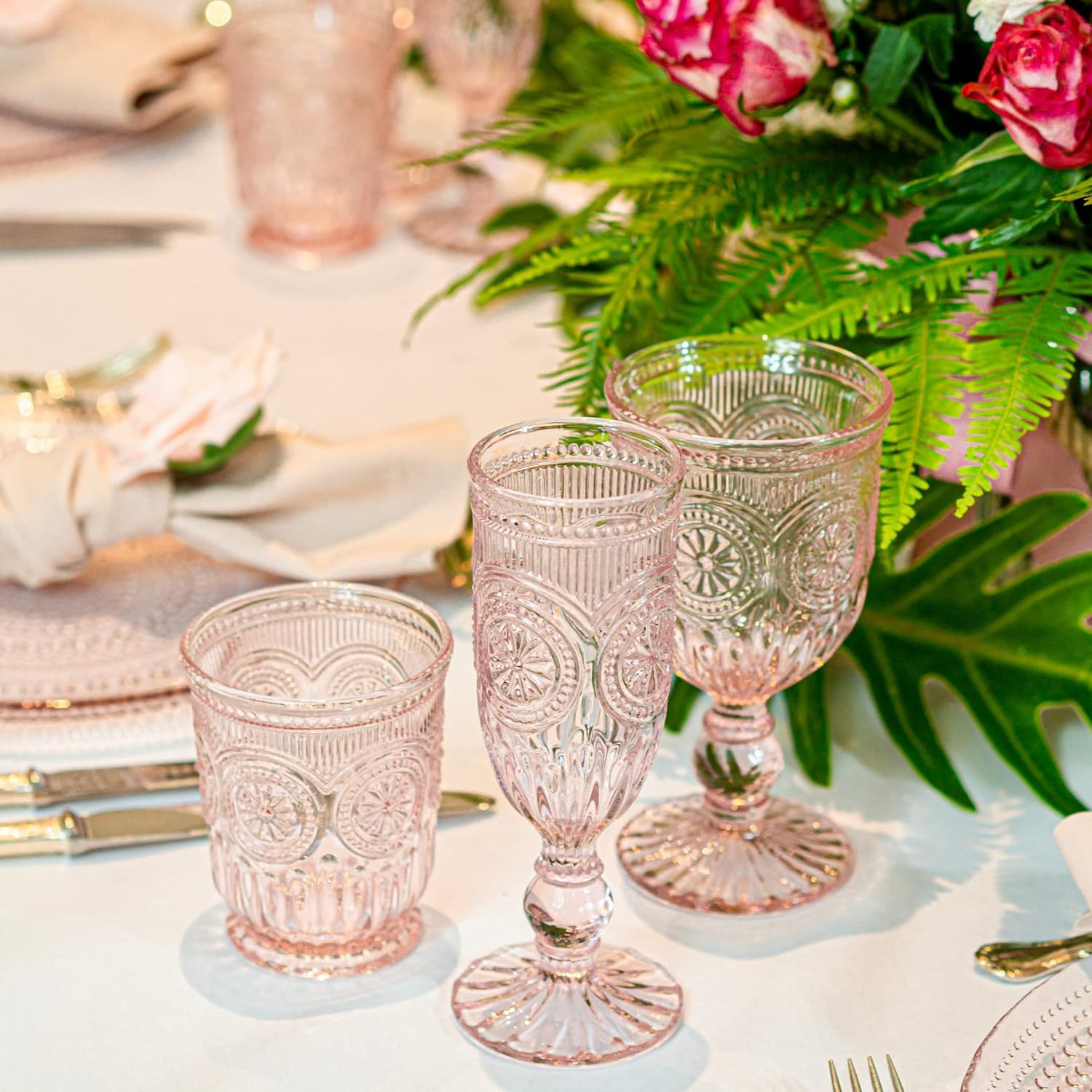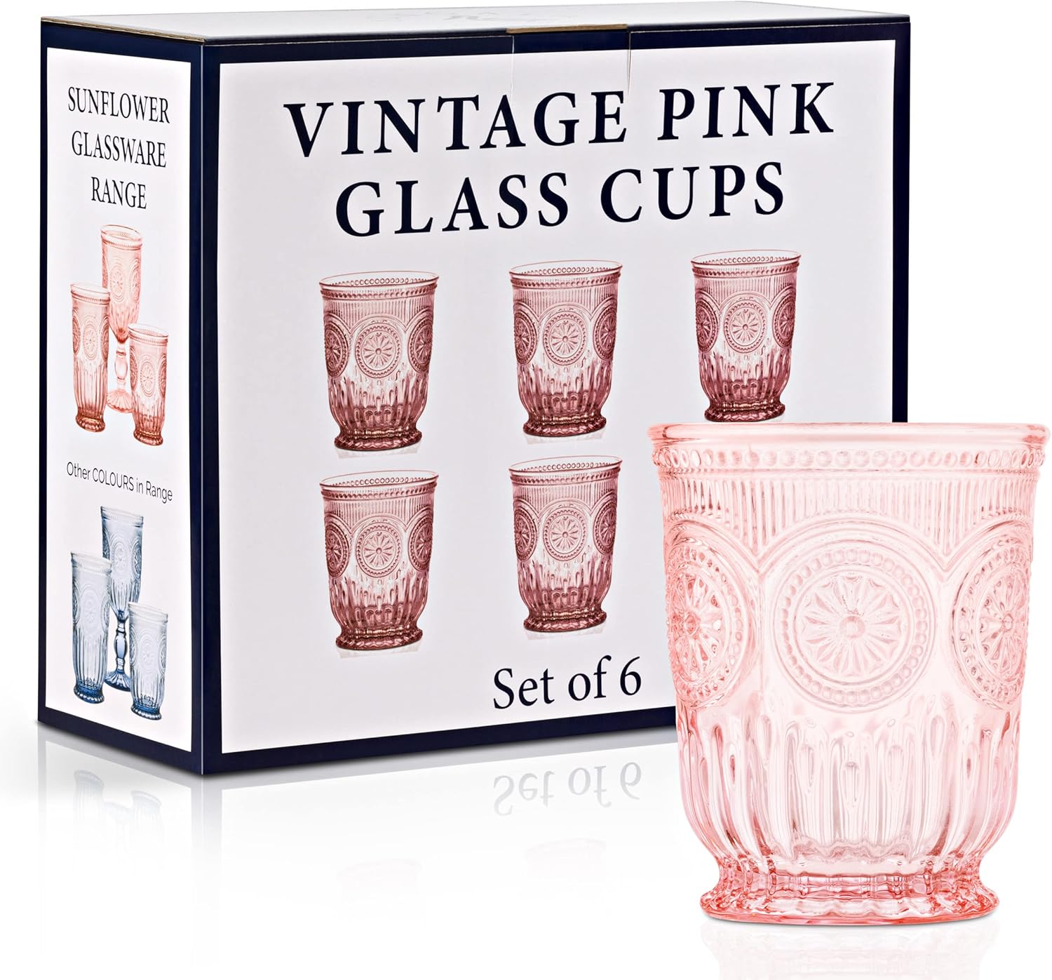 - The embossed pink glassware with sunflower inspired pattern is classic vintage glassware. Pair with our matching pink water tumblers for a glamorous and pretty tables cape filled with love and joy as you come together with friends and family, who will appreciate these tumblers party glasses are as individual as you. Vintage glassware embossed glass drinking goblets are sure to turn heads. Say no to boring and yes to color wine glasses.
